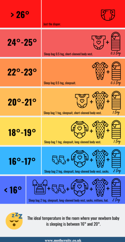 | Under 16°C | 2 tog sleep bag, sleepsuit, long-sleeved bodysuit, socks, mittens, hat. |